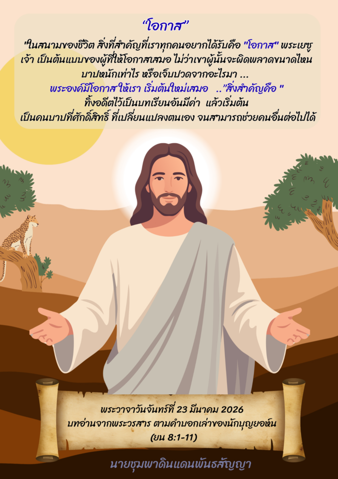“ในสนามของชีวิต สิ่งที่สำคัญที่เราทุกคนอยากได้รับคือ “โอกาส” พระเยซูเจ้า เป็นต้นแบบของผู้ที่ให้โอกาสเสมอ ไม่ว่าเขาผู้นั้นจะผิดพลาดขนาดไหน บาปหนักเท่าไร หรือเจ็บปวดจากอะไรมา … พระองค์มีโอกาส ให้เรา เริ่มต้นใหม่เสมอ
