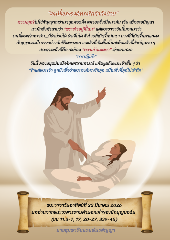 “คนที่พระองค์ทรงรักกำลังป่วย” ความทุกข์ไม่ใช่สัญญาณว่าเราถูกทอดทิ้ง หลายครั้งเมื่อเราล้ม เจ็บ หรือเจอปัญหา เรามักตั้งคำถามว่า “พระเจ้าอยู่ที่ไหน” แต่พระวาจาวันนี้บอกเราว่า